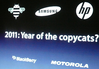 ジョブズCEOは、2011年について「(iPadの)“まねっこ”が世にはばかる年なのだろうか」とブラックジョークを飛ばして、おもむろに 「iPad 2」を発表。「2011年はiPad 2の年」と断言し、今年もアップルがスレート市場で圧倒的な地位を維持し続けるとした。
