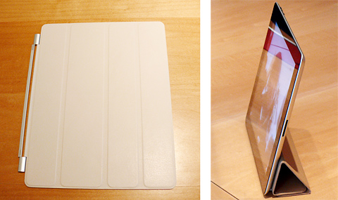 ポリウレタン製とレザー製で計10色を揃える「iPad 2 Smart Cover」(写真はレザー製)。iPad 2を立てて使うことができる