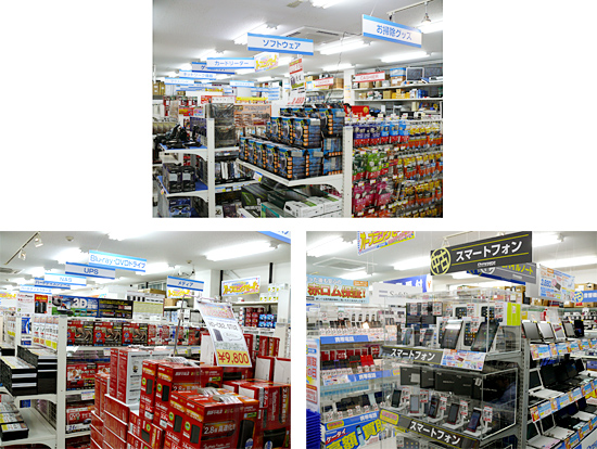 ドスパラ パーツ館は、売り場面積が1階と2階がともに約300m2、3階が約200m2、合わせて約800m2。1階でCPUやマザーボード、メモリなど、2階でPCケースや液晶ディスプレイ、ソフトなどを販売している。3階は、中古PCパーツや中古PC、中古携帯電話のコーナーがあるほか、買取カウンターやサポートセンターを設置。店内には「コンシェルジュ」という説明のできるスタッフを配置し、自作PC初心者の質問にも答えられる体制を敷いた。