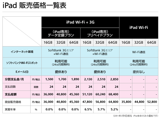 iPad 販売価格一覧表(ソフトバンクモバイルのウェブサイトより)