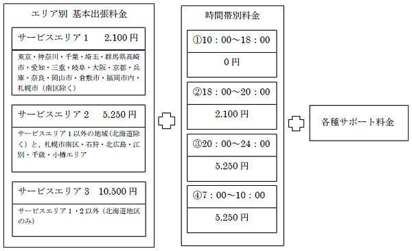 料金は、エリアや時間帯によって異なるが、エリア別で「2100円」「5250円」「1万500円」の3種類、時間帯別で「2100円(18-21時)」「5250円(20-24時/7-10時)」の2種類を用意しており、これに各種サポート料(料金は1575円から)が発生する。