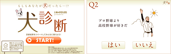 「犬診断」のスタート画面(左)、質問画面の例(右)