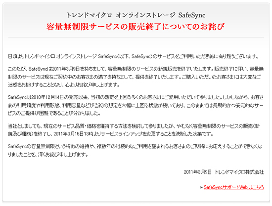 2010年12月14日の発売以来、当初の想定を上回る多くのユーザーが契約した結果、利用頻度、利用形態、利用容量などが当初の想定を大幅に上回る状況が続き、このままでは長期的・安定的なサービスの提供が困難だと判断した。「SafeSync」のユーザーに送付したメールやウェブサイトに公開した「重要なお知らせ」には、「SafeSyncの容量無制限という特長に期待されたお客さまや、複数年の継続的なご利用を望まれるお客さまのご期待にお応えすることができなくなりましたことを深くお詫び申し上げます」と、サービスの変更について謝罪している。