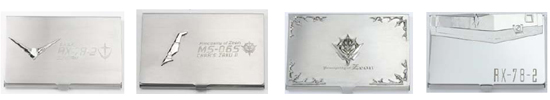カードケースは、「ガンダム」「シャアザク」「ジオンマーク」「ガンダムシールド」の4種類。「ガンダムシールド」以外の3種には、表側に劇中に登場する「ジオン軍」のマークやキャラクターのアイテムなどをモチーフにしたデザインを施した。ケースの内側には、各キャラクターの象徴的なセリフを刻印している。価格は「ガンダムシールド」が5250円、その他の3種は各3990円。