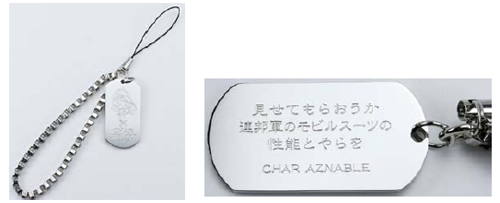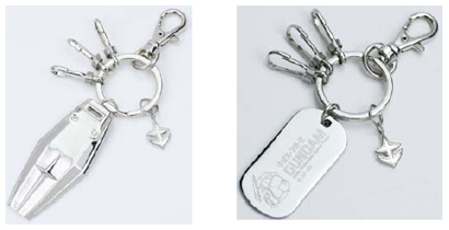 キーホルダーは、武器をモチーフにした「レザー武器ストラップ(ガンダムライフル・ザクマシンガン・シャアザクヒートホーク・ドムバズー)」、半立体のキャラクターをあしらった「鏡面立体ストラップ(ガンダム・シャアザク)」、キャラクターのイラストを施した「メタルイラストプレートストラップ(グフ:ランバラル、シャアザク:シャア、シャア・アズナブル:シャア、ビグザム:ドズル)」、キャラクターデザインとその象徴的なセリフを刻印した「メタルセリフプレートストラップ(ガンダム、シャアザク)」と、最も多い4種・12アイテムを用意する。価格は、「鏡面立体ストラップ」が各3990円、それ以外は各2100円。