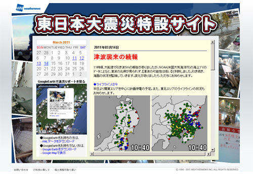 ウェザーニューズは、東日本大震災に伴い、災害に関する情報を掲載する「東日本大震災特設サイト」を開設した。