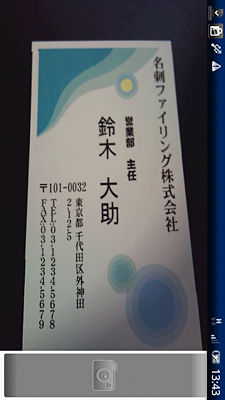 実際にダウンロードして、使い心地をチェックした。操作方法は非常に簡単。「やさしく名刺ファイリング Mobile」を「登録」モードにセットして、スマートフォンのカメラで名刺を撮影するだけだ。名刺の認識精度は優秀で、撮影時に多少の影がかかってしまっても問題なく認識してくれる。撮影場所を選ばないのもうれしい。