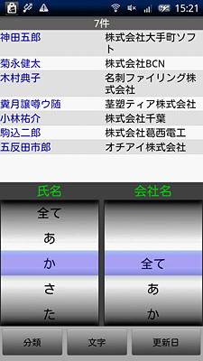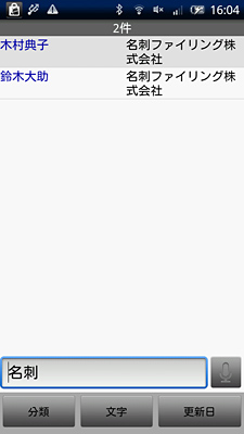登録したデータの管理も簡単だ。名刺の検索方法は「分類」「文字」「更新日」の3種類。「分類」では、会社名と氏名の頭文字で人を絞り込んでいく。「文字」では、氏名や会社名を対象にキーワードを指定することで、それに合致する人を探し出せる。音声入力にも対応しているので、歩行中など文字を入力できない場合でも、スムーズに検索することができる。「更新日」では、日付の範囲を指定することで期間ごとに登録した名刺データを表示してくれる。