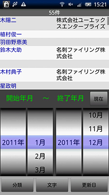 「分類」の絞り込み画面。社名と人名の頭文字を指定