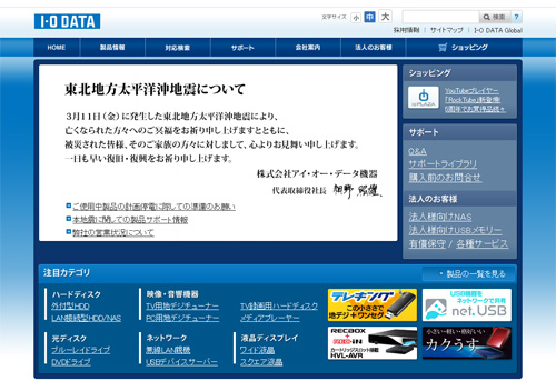 アイ・オー・データ機器は、東日本大震災を受けて、製品サポートと営業状況を発表した。また、ホームページのトップに、細野昭雄社長による被災者へのお見舞いの言葉を掲載している。