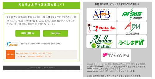 3月15日に開設した支援サイトでは、東北地方太平洋沖地震の被災地の現地情報を全国に幅広く伝えるために、au携帯電話・スマートフォンだけではなく、Flashコンテンツの再生に対応した他キャリアのAndroid 2.2搭載スマートフォンやパソコンでも聴取できるようにした。聴取可能なFM局は、TOKYO FM、FM青森、FM岩手、Date fm、FM秋田、FM山形、ふくしまFM。