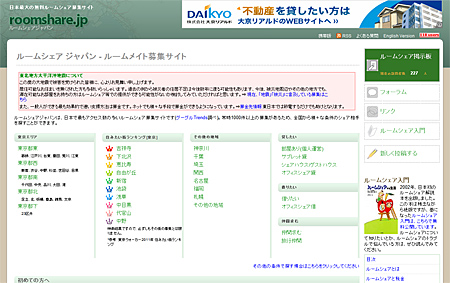 ルームシェア専門サイト「ルームシェアジャパン」を運営するルームシェアジャパンが、サイト上で、東日本大震災の被災者へのルームシェア/シェアハウス提供を呼びかけている。