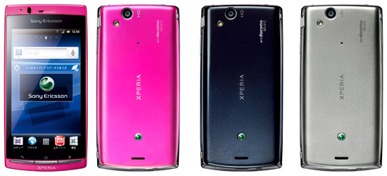 Xperia arc SO-01C(左からSakura Pink、Midnight Blue、Misty Silverの背面)