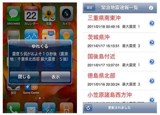 【震災関連情報】iPhone用緊急地震速報アプリ「ゆれくるコール」、無料サービス継続のため支援企業を募集