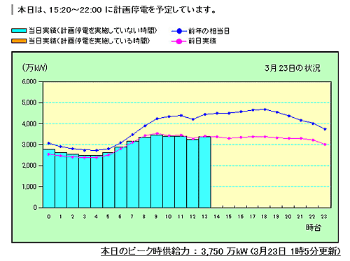 電力の使用状況グラフ(3月23日)