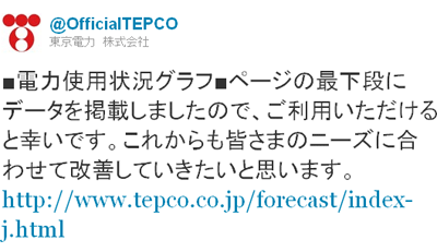 東京電力の公式Twitterアカウントでは、3月24日1時31分に、「■電力使用状況グラフ■ページの最下段にデータを掲載しましたので、ご利用いただけると幸いです。これからも皆さまのニーズに合わせて改善していきたいと思います。」と発信している。
