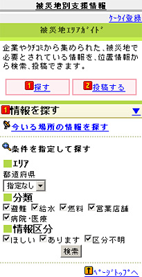 ヤフーは、3月28日、被災地の生活情報収集や「ほしい」「あります」などのニーズを発掘し、確認の手助けの場になることを目的とするモバイルサイト「Yahoo!JAPAN 被災地エリアガイド」を公開した。モバイル版を先行して公開し、今後、PC・スマートフォン版を追加する予定。