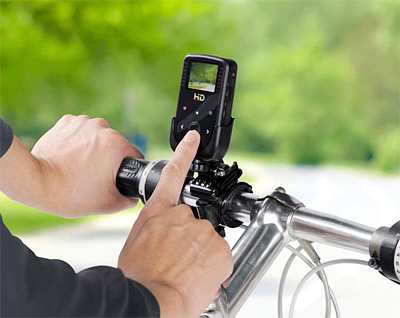 自転車のハンドル用アタッチメントが付属する小型ビデオカメラ。カメラの角度や向きを自由に変えることができ、走行風景の撮影や自分撮りが楽しめる。タッチパネル式の液晶モニタで、画角を確認しながら動画・静止画の撮影ができる。