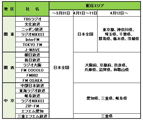 今後、4月1-11日は関西6局、中京7局を通常運営に戻し、4月12日以降は、残りの関東7局を含めたすべてのエリアで配信エリア限定サービスとして運用していく。