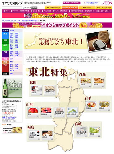 イオンは、3月28日、ネット通販サイト「イオンショップ」内に特設サイト「応援しよう東北!」を開設した。東北地方の生産者や取引先の協力の下、東北地方の特産品・名産品約150品目を販売する。
