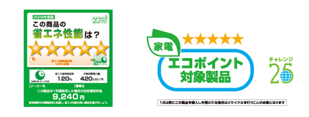 統一省エネラベル(左)、2011年1月1日からの2010改定家電エコポイント対象製品告知ラベル(右)
