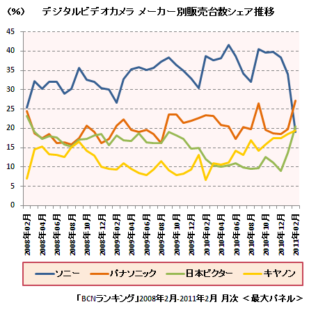 直近3年間(08年2月-11年2月)の「BCNランキング」メーカーシェアの推移をみると、1位はソニーで、販売台数20-40%程度で常にトップを走っていた。一方、パナソニックは09年1月に2位に浮上。それ以降も2位をキープし、3位以下の日本ビクターやキヤノンを引き離した状態だった。