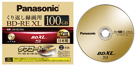 パナソニックは、2010年9月にBDXLに準拠した録画用追記型100GB Blu-rayディスク(BD-R)を発売。さらに今回、繰り返し使える録画用書換え型100GBのBlu-rayディスク(BD-RE)を追加し、長時間のハイビジョン番組や連続ドラマの映像を、高画質のまま1枚のディスクに録画するニーズに応える。