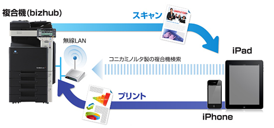 「PageScope Mobile」を使ってiPhoneやiPadでプリントやスキャンするイメージ