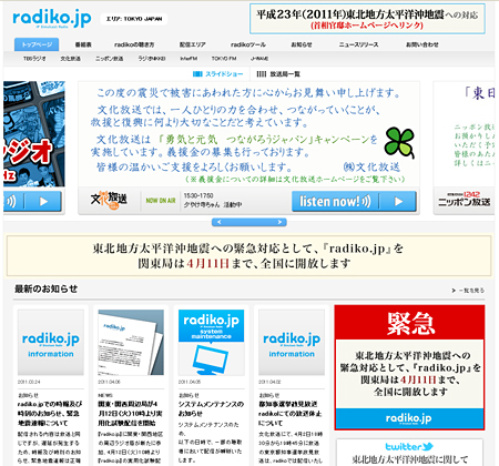 東日本大震災をきっかけに、音声だけで情報を得られる「ラジオ」が見直されている。現在、「radiko.jp」の平均週間延べ聴取回数は増加傾向で、約400万回前後で推移している。3月31日時点で、パソコンのブラウザを起動せずにラジオを聴くことができる「radikoガジェット」は約180万ダウンロード、iPhone版、Android版公式アプリは約200万ダウンロードに達している。