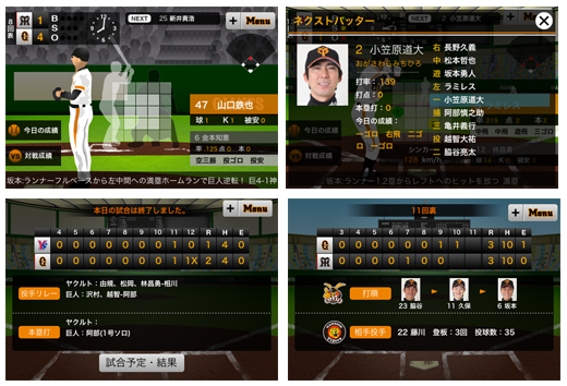 巨人軍の公式ウェブサイトや携帯サイト「モバイルGIANTS」で人気の一球速報をスマートフォンで楽しめるアプリ。カウントや配球、塁状況をひと目で把握できるだけでなく、対戦中の投手と打者の相性がわかる「マッチアップ分析」を盛り込んだ。