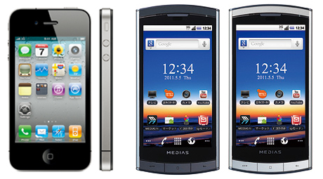 iPhone 4、MEDIAS N-04C(左からMEDIAS Black、MEDIAS White)