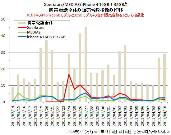 それでも、「Xperia arc」が発売直後に爆発的に売れたのは事実。携帯電話全体と、「MEDIAS」「Xperia arc」「iPhone 4 16GBモデル+32GBモデル」の3月14日から4月10日までの毎日の販売台数の変化を追うと、「MEDIAS」「Xperia arc」はともに発売日が最も販売台数が多く、その後は携帯電話全体と同じように、土日・祝日になると上昇し、平日になると下がるというパターンで推移している。「iPhone 4」もほぼ同じ傾向だが、駆け込み需要があったのか、年度末の3月31日は、その前後の平日より多かった。