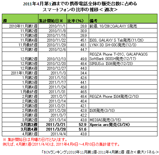 3月の携帯電話全体の販売台数に占めるスマートフォンの比率は47.1%。前月から2.8ポイント増えたものの、50%超えには至らなかった。週次集計では、「Xperia arc」が発売になった3月第3週(2011年3月21日-27日)に52.9%を記録し、初めて5割を突破。翌3月第4週(3月28日-4月3日)も5割を超えたが、4月第1週(4月4日-4月10日)には43.8%と、もとの水準に戻っている。