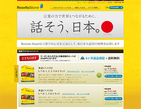 ロゼッタストーン・ジャパンは、「話そう、日本。」をテーマに、東日本大震災の復興を応援するプロジェクトを開始した。直販サイトと直営店で「Rosetta Stone Version 4 TOTALe」のアメリカ英語版などの対象製品を通常価格の25%オフで販売する。期間は4月末日まで。