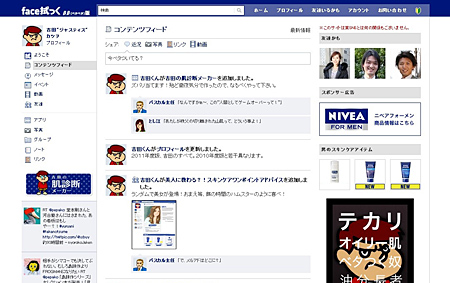 「face拭っく」では、いま話題のSNSをプロモーションに活用。宣伝マンの吉田くん曰く「フェースって、S=そう仰るだけで、N=ネットが沸き立つ、S=最高!」なSNS風のサイトだ。「吉田の肌診断メーカー」をはじめ、さまざまなコンテンツを通して、商品やスキンケアの知識を紹介する。