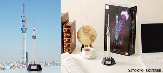 3月18日に最高高さ634mに達した「東京スカイツリー」の外観部の柱の本数や複雑な形状を忠実に再現した全高約264mmのプラモデル。最新技術を投入し、精密さと組み立てやすさを追求している。パーツ数はわずか23で、プラモデル初心者でも簡単に組み立てられる。