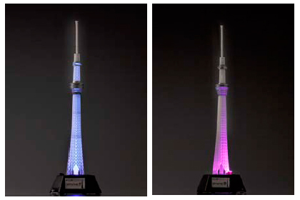 東京スカイツリーのライティングデザインも再現し、組み立て不要のLEDユニットベースのスイッチを切り替えることで、塔体中央部が水色に光る“粋風”、外側の柱を江戸紫色に照らす“雅風”の2種類のライティングイメージが楽しめる。電源は単4電池3本。