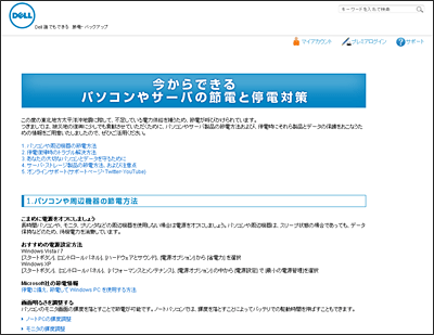 デルは、<a target="_blank" href="http://www1.jp.dell.com/content/topics/segtopic.aspx/misc/eq_support?c=jp&cs=&l=ja&s=gen">ウェブサイト上</a>で、パソコン・周辺機器の節電方法や、停電復帰時のトラブル解決方法などを公開している。