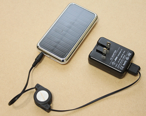 前面のソーラーパネルの出力は5.5V 80mAで、ソーラーパネルだけだとバッテリをフル充電するのに約30時間かかる。ACアダプタが付属し、こちらは3-4時間で充電できるので、時間を気にするときはコンセントを活用しよう。