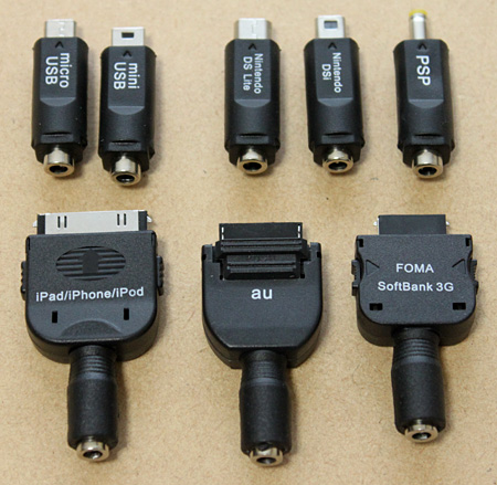 専用コネクタは全部で8種類。iPhone/iPodなどで利用するドックコネクタをはじめ、NTTドコモやソフトバンクモバイル、auなどの携帯電話用コネクタ、スマートフォンなどが採用しているmicroUSB/miniUSBコネクタ、PSPやニンテンドーDSi/DS Liteなどの携帯型ゲーム機用のコネクタがある。使わないときは、付属のキャリングポーチに入れておくと、なくさずに済む。