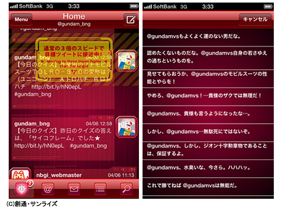 バンダイナムコゲームスは、4月25日、iPhone用Twitterクライアント「シャア専用モビルTwit」を、アップルが運営する「App Store」で発売した。価格は350円。
