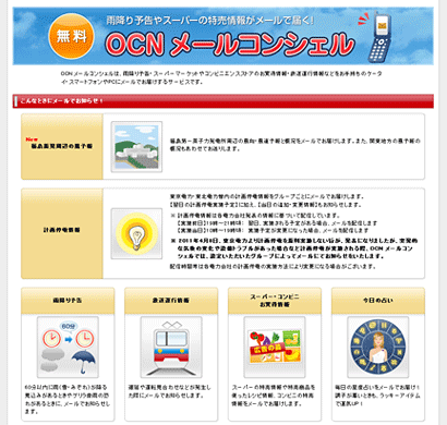 「OCNメールコンシェル」は、携帯電話・スマートフォンで受信できる地域密着型のメール配信サービス。地域などの項目を登録することで、天気、電車の運行情報、今日の占い、スーパーの割引情報など、さまざまな情報を受け取ることができる。