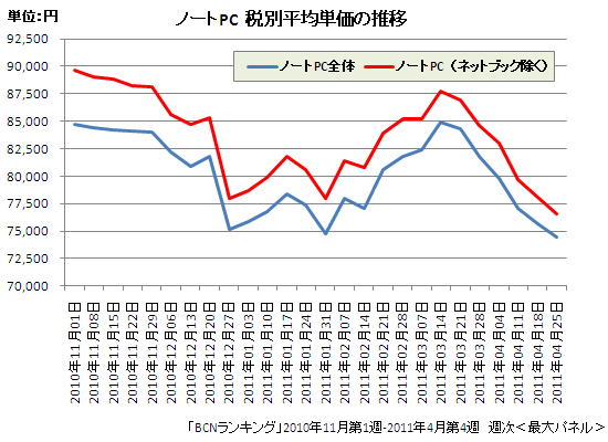 そうしたなか、4月に入り、ノートPCの価格が下がり始めた。3月第1週(2011年3月7日-3月13日)は8万2361円、3月第4週は8万1808円と、3月の間は8万円台で推移していたノートPCの税別平均単価は、4月第1週は7万9795円、第2週は7万7110円、第3週は7万5638円と週を追うごとに下がり、特に4月第2週は、前週比マイナス2685円と大きく下がった。