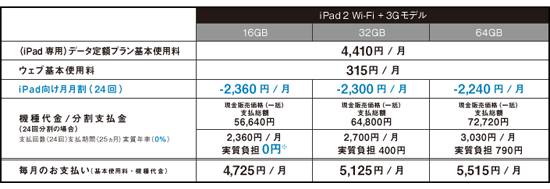 iPad 2 Wi-Fi + 3Gモデルの月々の支払いイメージ