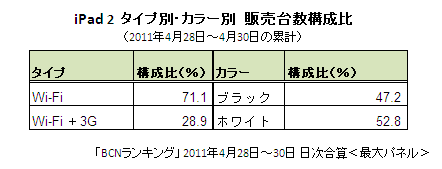 量販店の実売データを集計した「BCNランキング」で、2011年4月28日から4月30日までの3日間の「iPad 2」のモデル別累計販売台数を集計すると、1位はシェア24.6%でWi-Fiモデルの16GB、2位はほぼ同率のシェア24.2%でWi-Fiモデルの64GB、以下、Wi-Fiモデルの32GB、3Gモデルの64GB、32GB、16GBの順だった。カラーバリエーションを合算しない機種別では、iPad 2 Wi-Fi 16GB ホワイトがトップとなり、2位に僅差でiPad 2 Wi-Fi 64GB ホワイトが続いた。