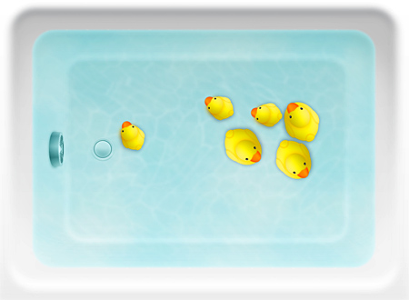 「SmartTub」は、iPadの画面を風呂に見立て、お風呂用のオモチャのアヒルがゆらゆら浮く様子を眺めるだけの癒し系アプリ。起動すると、アヒルが2羽表示され、iPadを傾けたり、アヒルを指で弾いたりするとアヒルが動き、アヒルにタッチするとアヒルが鳴く。さらに、iPadを振るとアヒルの数が増えていく。