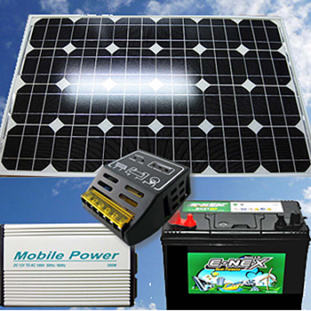 システム構成は、太陽光発電モジュール(ソーラーパネル50W)/架台(キャスター付)/シガーソケット/DC-ACインバータ200W/ディープサイクルバッテリ90Ah/チャージコントローラ/配線。増設用の太陽光発電モジュールは、単体50W(12V仕様)を1万4800円、架台付きを1万9800円で販売する。また直販サイトでは、構成品の単品販売も行う。