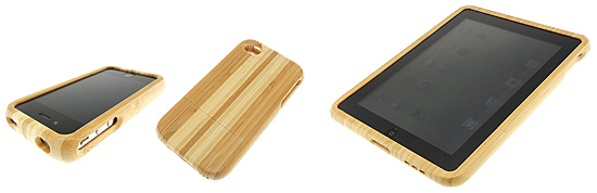 左から、iPhone 4専用竹製ハードケース(表面/背面)と初代iPad専用竹製ハードケース(表面)