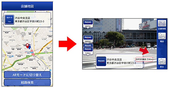周辺にあるみずほ銀行のATMや店舗を検索。カメラなどを通して表示した現実の映像に、関連する文字や画像、映像などを重ね合わせて表示する現実拡張技術(AR)を採用し、スマートフォンのカメラを通した映像に周辺店舗の方向や距離などを表示することができる。