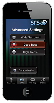 専用アプリ「SRS iWOW アプリ」を、アップルの「App Store」から無料でダウンロードしてiPhone/iPod touch/iPadにインストールすることで、「サラウンド感」「重低音」「高音」の音質設定を好みに合わせてカスタマイズできる。